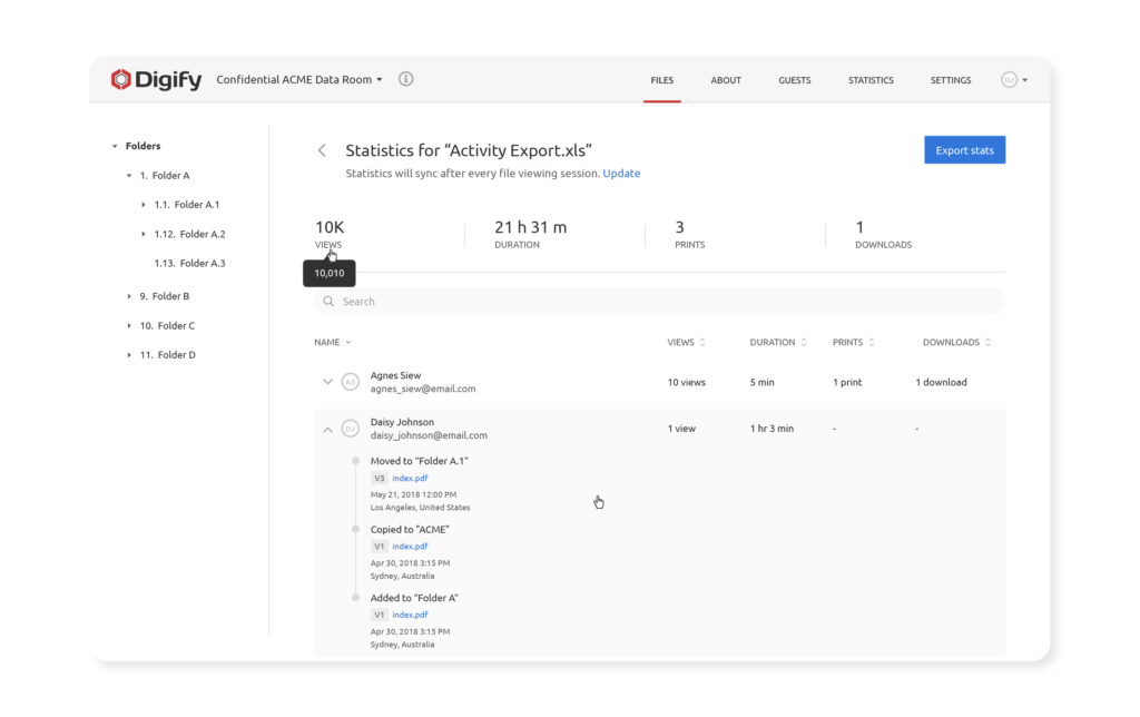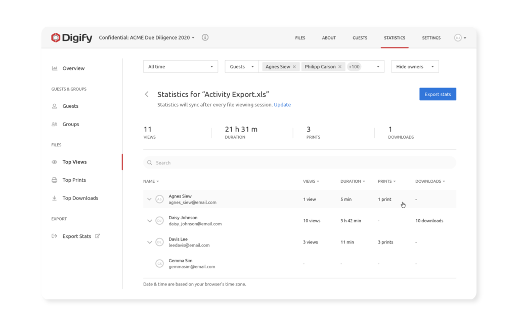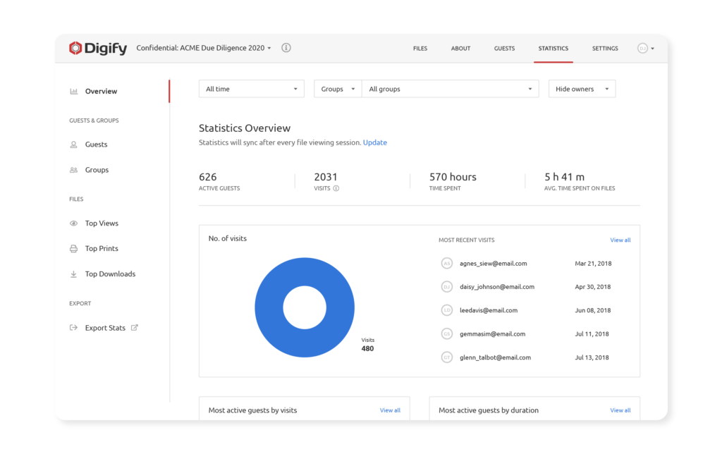 Data rooms are helpful for quickly and easily providing you an overview of document analytics, such as the ability to see rankings for who has spent the most time viewing a document, and who visited the most. You can see which documents are the most popular and all of this information can help you to hone and prioritize your follow up efforts.