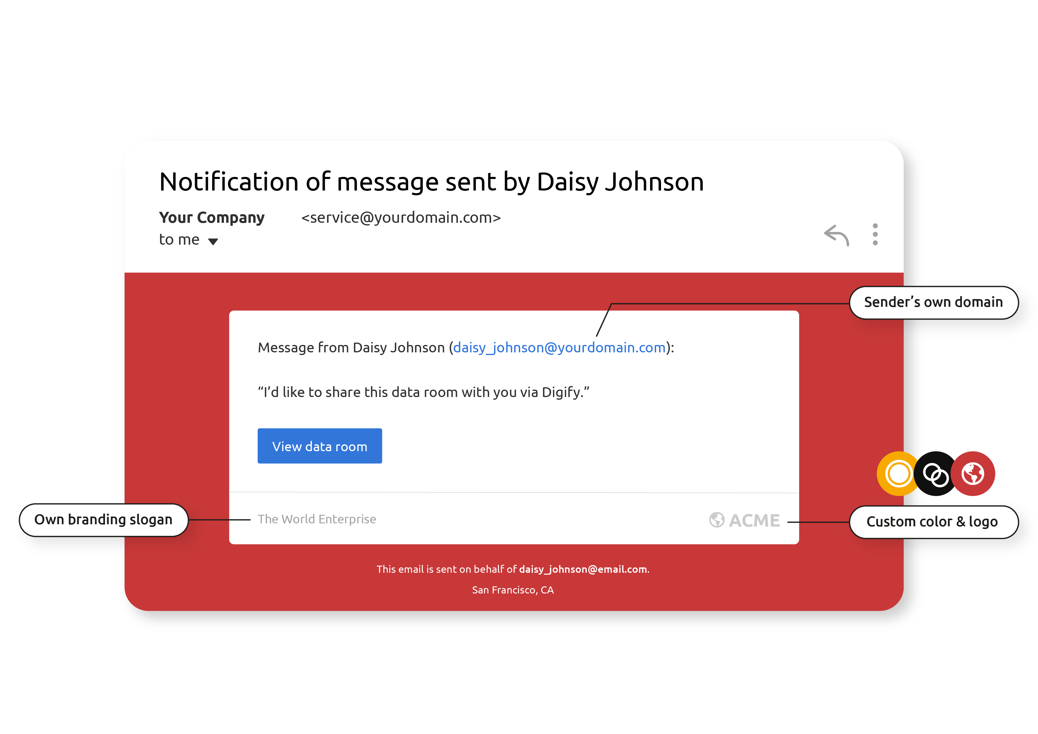 All Digify Data Rooms come with branding features such as custom logo and brand colors, a banner, and an About page.