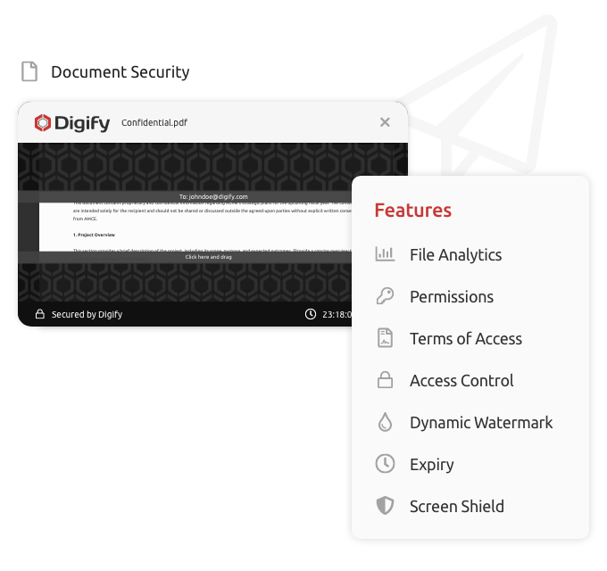 Integrate with Digify’s powerful suite of document security features to secure, manage and share documents. Get access analytics, control who sees your files and guard document content with dynamic watermarks, screenshield, expiry settings, and more.